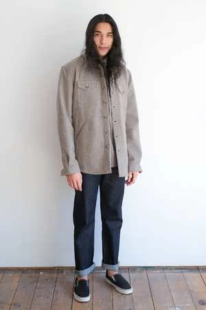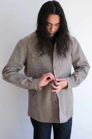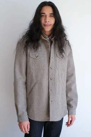 This durable overshirt is made from a 14 oz Melton Wool and features reinforced elbow construction, two exterior chest pockets, lower welt hand pockets, a single inside pocket, snap closure at neck, and keyhole buttonholes throughout.