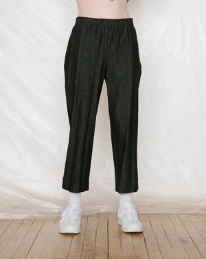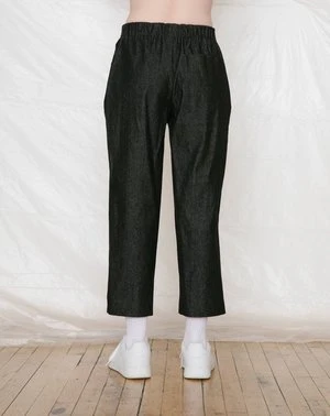 Your new go-to easy pant. Features a relaxed straight leg, elastic waist, in-seam side pockets, 1 back patch pocket, and a slightly cropped length. Tag size aligns with standard menswear. Yara is 5’6 and wears an XS.