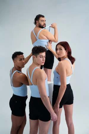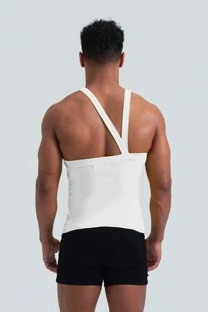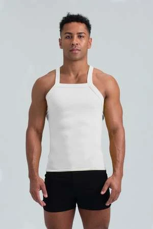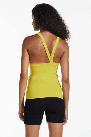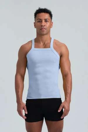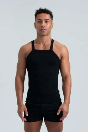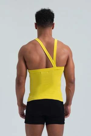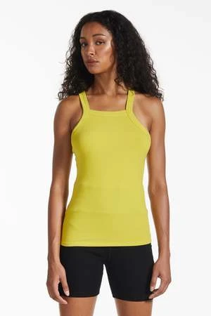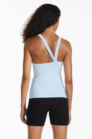 An inspiring new take on our classic ribbed tank with the Square Neck design, while showcasing the back with a unique asymmetrical strap design. A comfortable, shape-defining tank for the daytime, yet a sensually eye-catching piece for nights out. Features our logo embroidery, and offered in four colors: black, white, baby blue, and lemon.