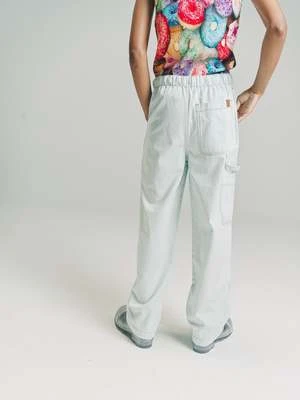 Drawstring trousers in lightweight denim with side pockets, one rear patch pocket and contrast topstitching. Relaxed fit. Concealed button fastening. Embossed Anagram calfskin tab.