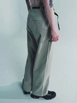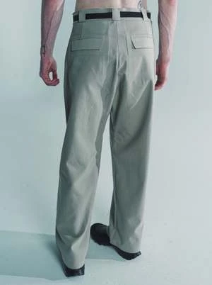Oversized chino pants. Made using cotton that comes with a velvet finish. Wear them as a technical item or everyday pants. Adjustable cinch straps for the waistband. Regular side pockets and flap protected back pockets. Features; cotton with a velvet finish, cinch straps for quick size adjustment, flap protected back pocket, open side pockets.