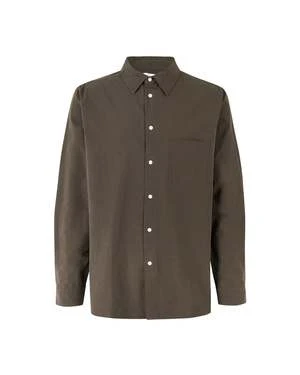 Loose long-sleeved shirt, V-neck and chest pocket. Yoke seam at nape with pleats. Button closure in the center front and cuffs, rounded hem.